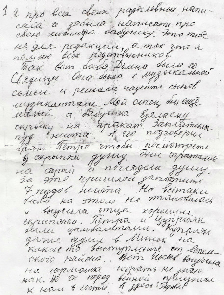 Мартин Минчук, маці распавядала пра ўсё. Толькі я не ўсё запомніў, таму баюся нагарадзіць абы чаго, пра што добра не ведаю. А добра ведаю вось што. Маці ў старасці некалькі месяцаў жыла ў піцерскай дачкі. Рабіць ёй не было чаго, і я па тэлефоне загадаў пісьмова занатоўваць успаміны пра жыццё. Спачатку адмаўлялася, спасылаючыся на тое, што ўжо рукі не слухаюцца, але ўрэшце рэшт здалася. Вось у тым сшытку ўсё па праўдзе. Гэта старонка з яго: