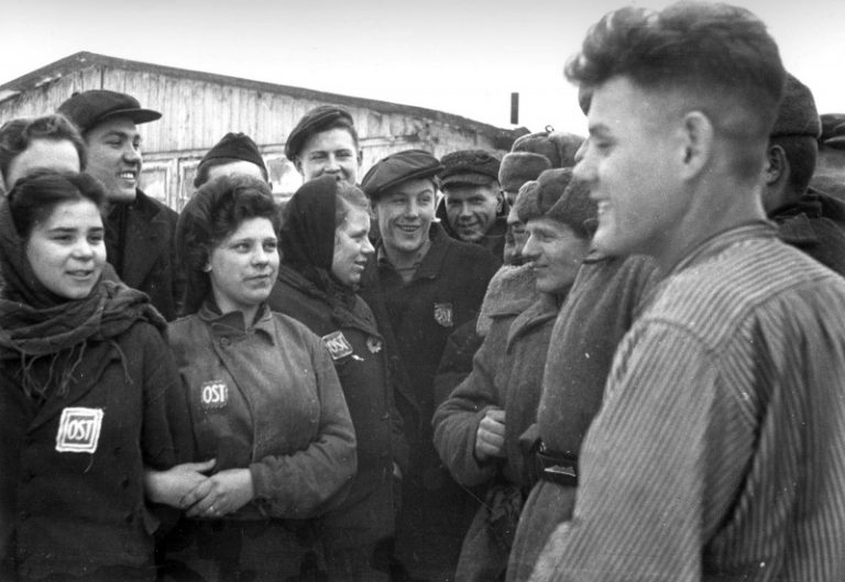 А если не обращать внимания на нашивки, то и не скажешь, что в кадре остарбайтерин. И часы попадаются, и кольца, и обувь приличная, галстуки, причёски … .