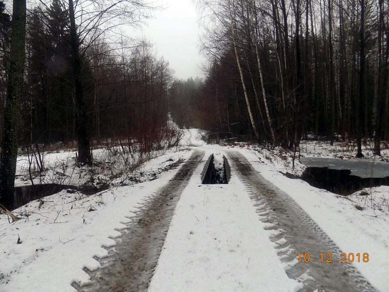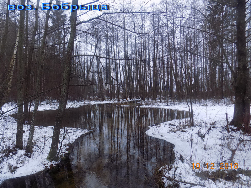 Пересечение речки полигонной дорогой в полукилометре от озера Бобрица (600 метров по извилистому берегу), из которого она вытекает, устроено именно там потому, что ближе к озеру берега заболоченны. Поперёк речки положили брёвна, оставив в центре «окно», через которое бежала вода в своё природное русло. А верхние, «надоконные», целые по длине бревна пустили над водой, по ним ходили пешком. Брёвна в диаметре небольшие. Чтобы не было щелей, засыпали землёй всё, кроме «окна». Ниже по течению, за брёвнами, пересыпали пересечение песком (пересыпка, одним словом), чтобы по мелководью на технике проехать. Брёвна вросли в землю берегов и опустились в песок дна, а «надоконные» пришли в негодность, неудобно стало по ним переправляться. Поэтому с другой стороны дороги, на несколько метров ниже по течению, временно (без всяких укреплений и засыпок) бросили новые стволы деревьев.