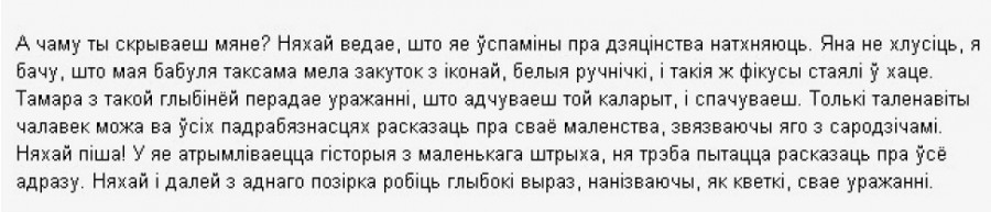 - Ай не, матачка, - так она зовёт бабу Прокопиху. – То ж мама адна жыве, дык яны ўсё больш у яе. Дапамагчы трэба ж – цяжка ёй адной.