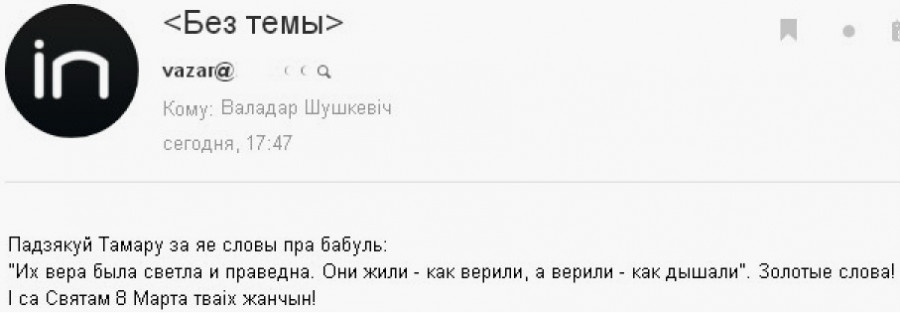 А ад сябе асабіста віншуе цябе з жаночым святам. Што тычыцца характарыстыкі тваіх твораў, яе за мяне дае Блукачыха.