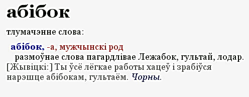 Вось назваў сябе абібокам, і самому спадабалася характарыстыка такім словам сваёй натуры. Можа мне сабе ўзяць такі чарговы нікнэйм? Як мяркуеце? Абібок! Як прыгожа! І адпавядае рэчаіснасці. А каб было больш зразумелым значэнне гэтага слова, паказваю скрыншот з тлумачальнага слоўніка "Скарнік":