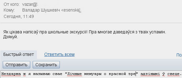 Скрыншот электроннага пісьма ўраджэнца Верабак Васіля Азаронка з Юрмалы: