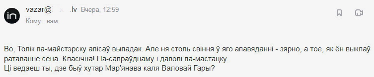 - Как только спустился с сеновала, первое, на что обратил внимание, так это на свинью за загородкой. Она, зараза, ещё как будто улыбалась, держа новенькие брюки в зубах. И кусок порванной колошины закрывал ее пятак, как будто зверюга была в маске.