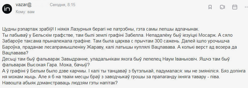 Неужели все эти местные любители под стать сумасбродному Блукачу, которого хлебом не корми, а дай от передряг общества уединиться типа сюжету анекдота, нынче напечатанного в «Лепельском крае». Вот его суть. Друзья делятся информацией о своём отдыхе. Один хвастается, что отдыхал в Египте, где всё включено. А второй под стать другу восхищённо информирует, что отдыхал на природе, где всё выключено.