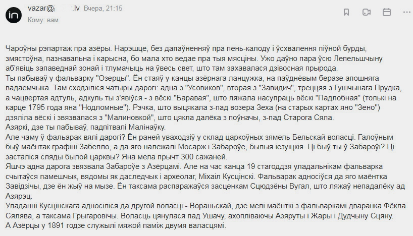 P.S. А что касается "бездуховности местного населения во все времена" и будто бы "несвойственности нашим людям утруждать себя лишними нагрузками, типа придумывать названия как бы незначительным объектам", то не следует забывать и о том, что во времена СССР была проведена соответствующая "деятельность" властей по целенаправленному уничтожению во время коллективизации ранее повсеместно бывших на Лепельщине многочисленных хуторов (кстати, в Западной Беларуси многие такие хутора по известным причинам сохранились до сих пор), а в 60 - 80 годы двадцатого века и по обезлюдиванию так называемых "неперспективных" деревень (например, в 1978-1981 годах я работал инструктором Лепельского райисполкома и хорошо помню. как одного из молодых местных мужчин на заседании райисполкома оштрафовали на большую сумму денег за полностью завершённое им строительство жилого дома для своей семьи в якобы "неперспективной" деревне и, кроме того, обязали его снести этот дом за своей счёт), жители которых прежде всего и являлись носителями названий всех этих будто бы "незначительных объектов". Притом. так было получилось, что в 2009 году в районной больнице в Лепеле в одной палате с моим отцом проходил лечение очень пожилолй уроженец той местности с озёрами, которые ты, Блукач Валацужны, описываешь в своём этом путешествии, и этот ветеран, постоянно тогда проживавший уже в Лепеле, мне рассказал о двух из этих озёр, объяснил, как к ним добраться со стороны деревни Подлобные, чтобы можно было наловить в них рыбы и, при этом, называя эти озёра конкретно, а не "пятое", "шестое" и т. д. К большому сожалению, названия этих озёр я не запомнил, как и многие другие подробности, о которых он мне тогда сообщил, поскольку всего через несколько дней мой отец прямо в больнице умер и это большое горе, настигшее меня тогда, очень многие подробности из тогда произшедшего стёрло из моей памяти.