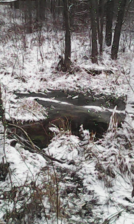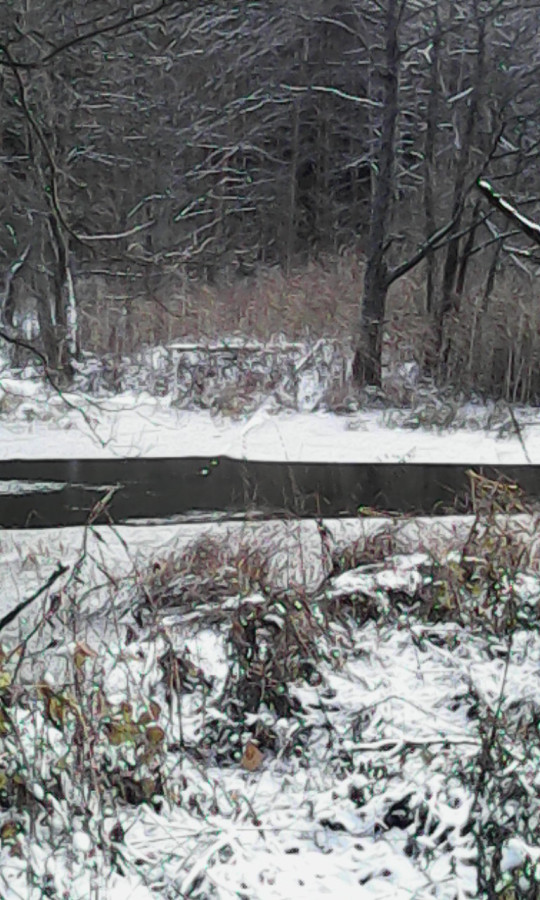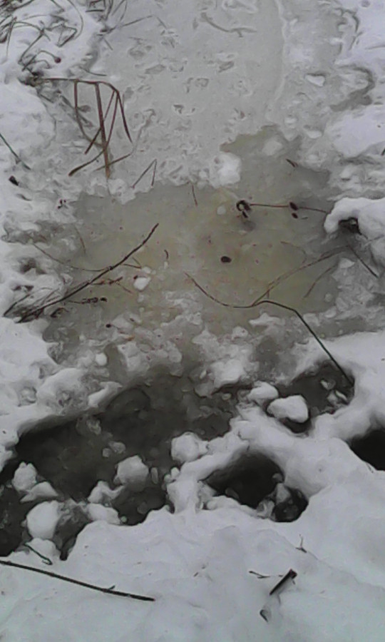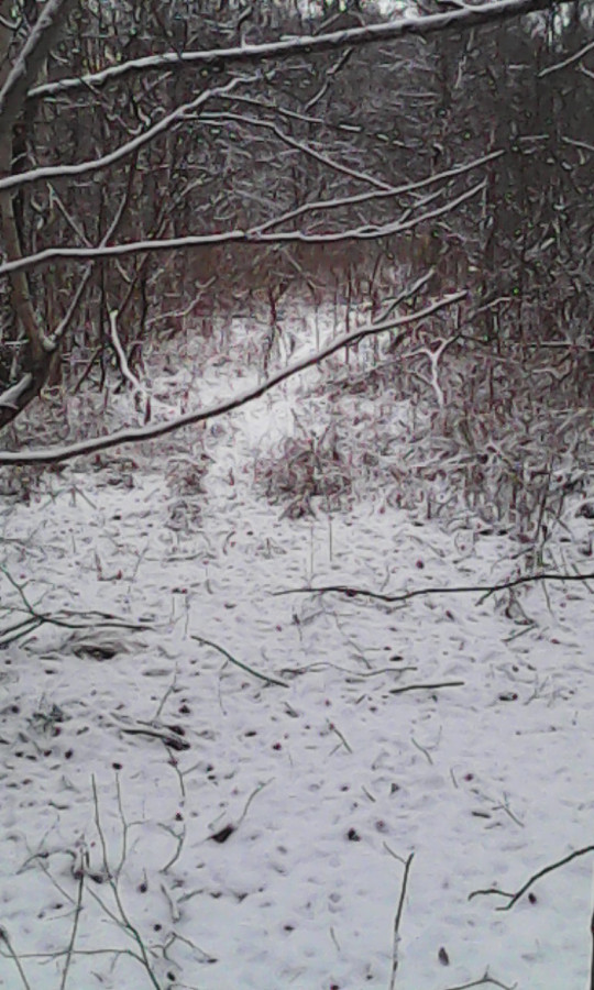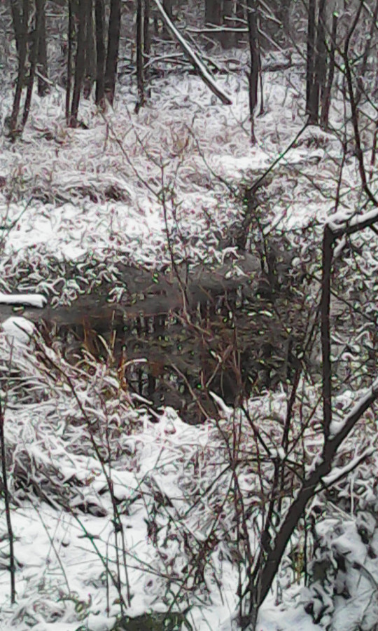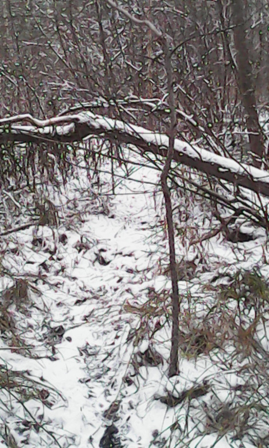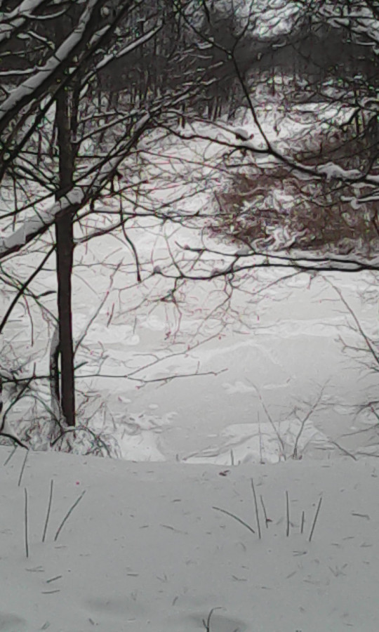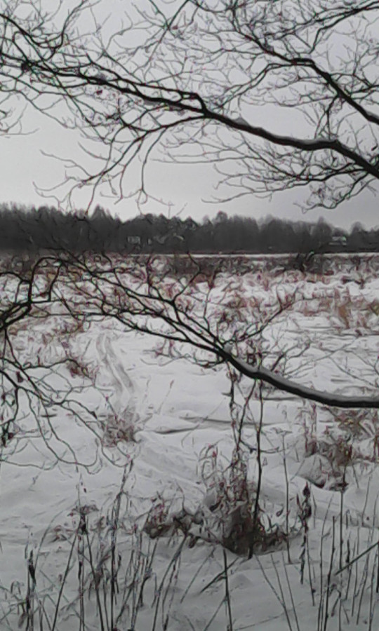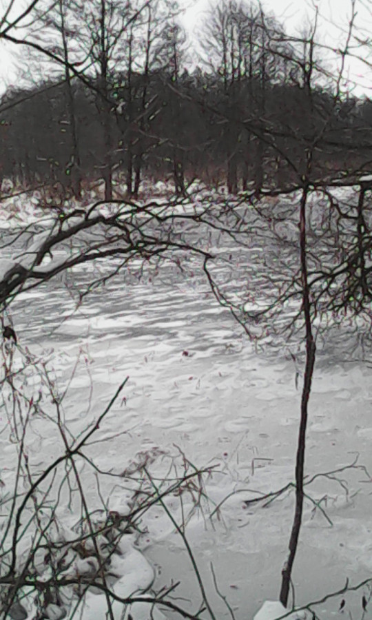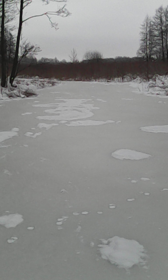 Лёд ужо даволі трывалы і мне удалося перабрацца на Іван-зарэчную. Толькі каля берага пад травой лёд слабы. Я там пакінуў яловы кол, прыслонены да альхі. Колам я правяраў лёд на трываласць.