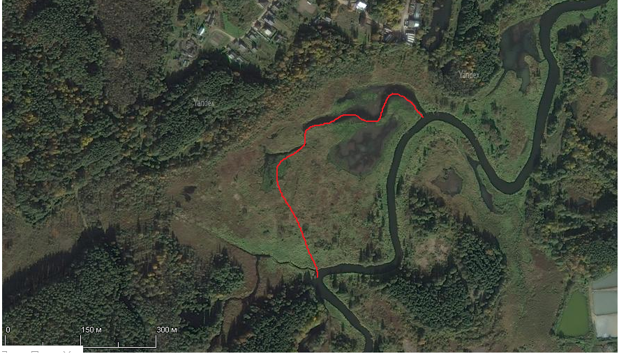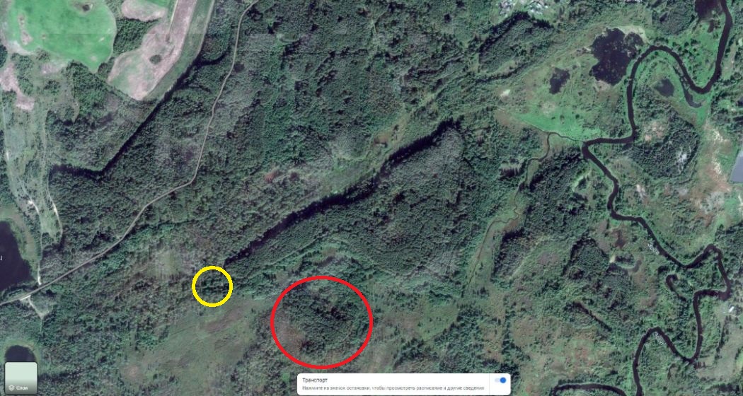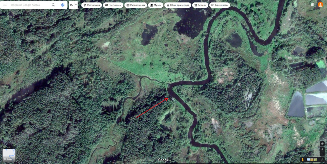 Слева параллельно дороге тянется хорошо видимое болото. Узкое. За ним – подобная Гайку виретия. Проходимцу хочется попасть и на неё. Для того спускается с гребня гряды. Сунется в болото. В нём – вода и, по всей видимости, речка или канал по центру.