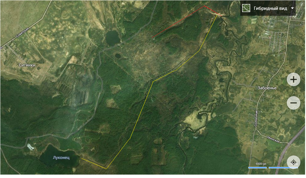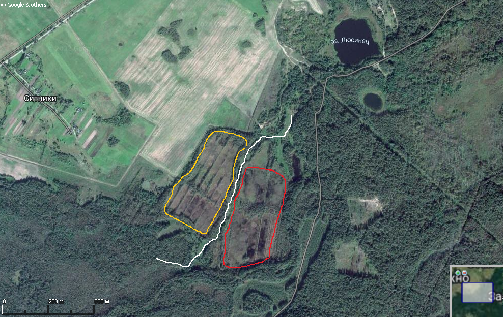Блукач ВАЛАЦУЖНЫ, я памятаю як на торфзаводзе яшчэ заставаліся бункеры для падбору торфакрошкі. У тыя часы яшчэ не пазарасталі асушальныя каналы і па палях можна было прайсці па сухому. Гэтыя палі я абвёў чырвоным колерам. Магчыма што торф здабывалі і на палях што я абвёў жоўтым колерам, але у той час яны ужо зараслі хмызняком. Па верацяі, якую я пазначыў белым колерам праходзіла дарога ад Люсінца у Сітнікі і у Гарадзец. У той час па берагах асушальных каналаў было многа суніц.