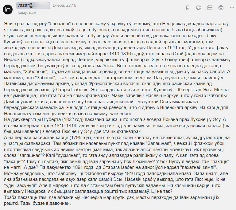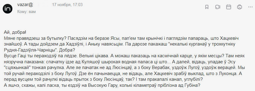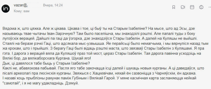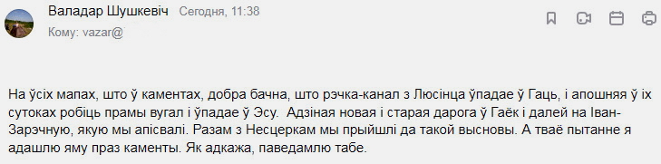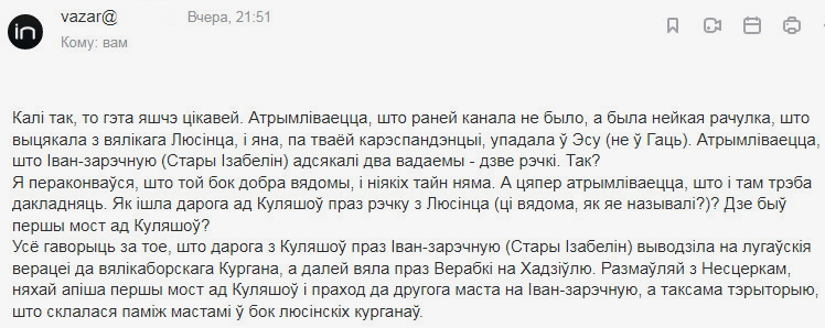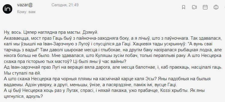Несцерка, вось над чым працуе Вазар. Хоча ведаць дарогу з Куляшоў на Іван-Зарэчную. Баюся памыліцца. Намалюй ты яму на мапе гэты шлях. І масты яго цікавяць. Мяркую, што першы - той, што я штурмаваў на драндулеце. І на іншыя пытанні адкажы, калі можаш. Словам, даю яго допіс, свой адказ яму, а твой дашлю ў Юрмалу: