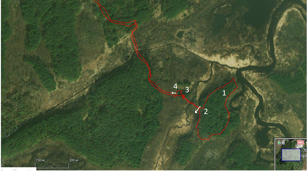 Блукач ВАЛАЦУЖНЫ, прыблізна так выглядаў твой маршрут. 1 - ты узышоў на Іван-зарэчную. 2 - стрэлка паказвае напрамак здымка балота. Там бачна пятля рэчышча якую ты палічыў дарогай. Я дакладна ведаю што дарог там няма. 3 - ельнік, які ты назваў соснякам і пра які я пісаў што на яго трэба арыентавацца, каб трапіць на Іван-зарэчную. 4 - былая дарога ад ельніка да Гайка, зараз яна амаль зарасла, ледзь прыкметная. А далей, на апошніх фота - Гаёк. Магчыма я памыляюся, але я уяўляю так. Чырвоным колерам пазначаны трэк майго учорашня
