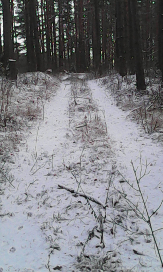 …Лесная дорога из Кулешов в лес разбита колёсами тяжёлой техники. Следы свежие. В нескольких сотнях метров от Кулешов часть дороги уходит вправо и карабкается на гряду-веретию, левая часть под прямым углом уходит в болото на старую насыпную дамбу. Последняя представляет глубокие колеи вязкой грязи. Хорошо, что хоть между ними старается удержаться драндулет.