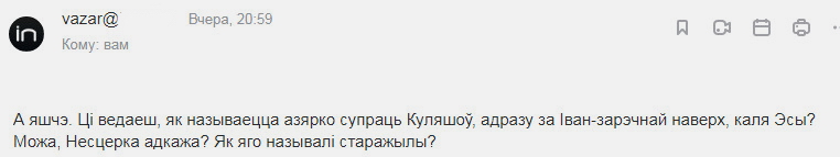 Несцерка, я зразумеў адразу. Але Вазару зноў пытанні жыць не даюць. Спытай ды спытай Несцерку... Словам, чытай сам. Можаш - адкажы: