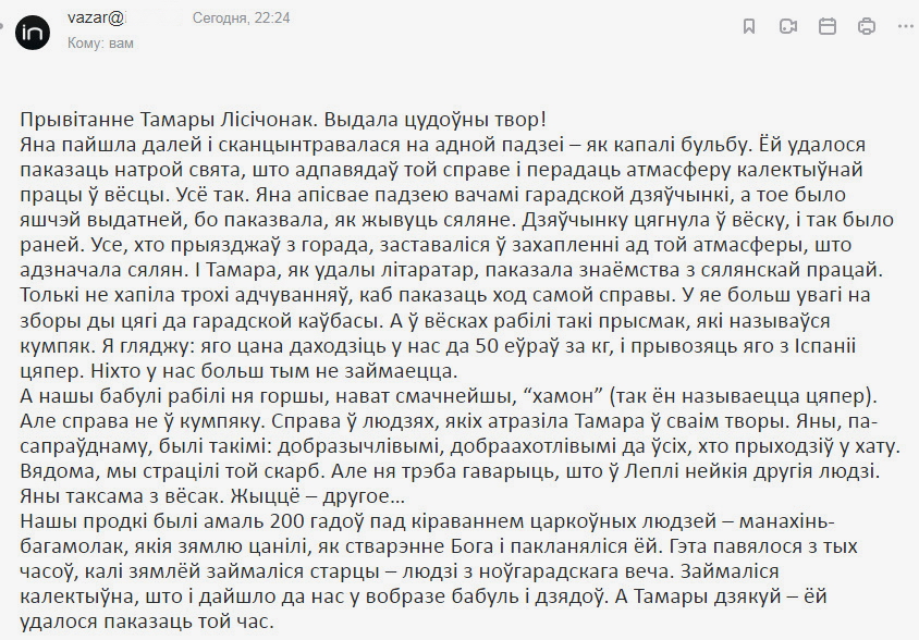 Словам, дакументальнае апавяданне"Едзем капаць бульбу" атрымалася накшталт легендарных "Пяці лыжак заціркі" Змітрака Бядулі. У гісторыю павінна трапіць "Капанне бульбы" абавязкова. Нават у школьную праграму!Всегда жду оценки Вазара, как профессионала. Почему так запомнилась колбаса? возможно потому, что в магазинах Лепеля она была редкостью, почитай что до Гобачёвской перестройки. Помню как ездили за ней, как на экскурсию в Минск. И кумпяки помню, тоже вкуснятина, не хуже городской.Только для сельского жителя в то время городские присмаки были диковенней и смачней, видимо потому, что были дефицитом.