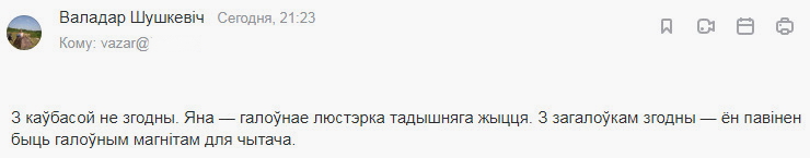 Я не згодны толькі з тым, што аўтар шмат увагі надала каўбасе. Але ж яна не прымалёўвала тадышняй ідэалогіі, а пісала "точь-в-точь". І атрымалася самая што ні наёсць сапраўлная роля каўбасы ў савецкай грамадскасці 1960-х, і асабліва ў жыцці школьніцы-сямікласніцы. Нечуваная прысмака, ласунак, каштоўнасць, рэдкасць! І дужа вялікую ролю ў творы згуляла як бы нязначная фраза: бацька купіў каўбасу ў "Ваенгандлі". І гэта жыўшы ў Лепелі, дзе такой формы гандлю не было. Значыць, каўбаса з мілітарысцкіх Бароўкі, Заслонава ці Межыцы. Адсюль вынікае, што каўбасой кармілі савецкіх мілітарыстаў, а не свой народ. І якімі хацючымі вачыма глядзелі на каўбасу за дзень да паездкі! Цэлая палеміка атрымалася наконт развагі, пачаць яе каштаваць да паездкі на бульбу, ці не. Але ж тады пачатая каўбаса не стане сюрпрызам для сялянскай радні. Вымі каўбасу з твору, і ён ужо не будзе такім якасным.