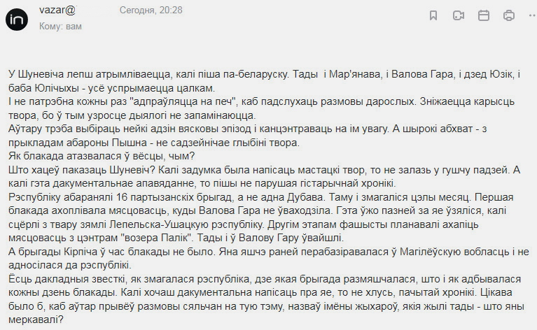 - Без адзінага кіраўніцтва парадку не будзе. Бачыш ты, не хочуць, каб імі кіраваў чалавек з трохкласнай адукацыяй. А я бачу, што Фаміч кожнага з акадэміяй за пояс затыкне. А то ўся партызаншчына бы тая баба з растапырынымі пальцамі альбо як у нядружнай сям’і – кожны на сябе коўдру цягне.