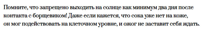 ТНИ, дастаткова секунднага кантакту з дзённым святлом пасля кантакту з баршчавіком, каб атрымаць апёк скуры. А ўвогуле ёсць на тое інэт - там усё: