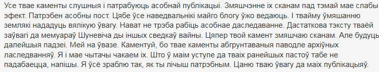 Сей коммент печатается по просьбе автора Анатолия Шуневича. Он не принимает обвинения в свой адрес, что в мемуарах перепутал 1943 и 1944 годы. К сведению интересующихся: было дае блокады партизан - в 1943-м и 1944-м годах. Ход войны он описывает в хронологическом порядке. Облава в Валовой Горе и расстрел 13 мужчин на хуторе Марьяново проводились именно в первую блокаду. Он может ошибиться в числах месяца, но никак не в годах.