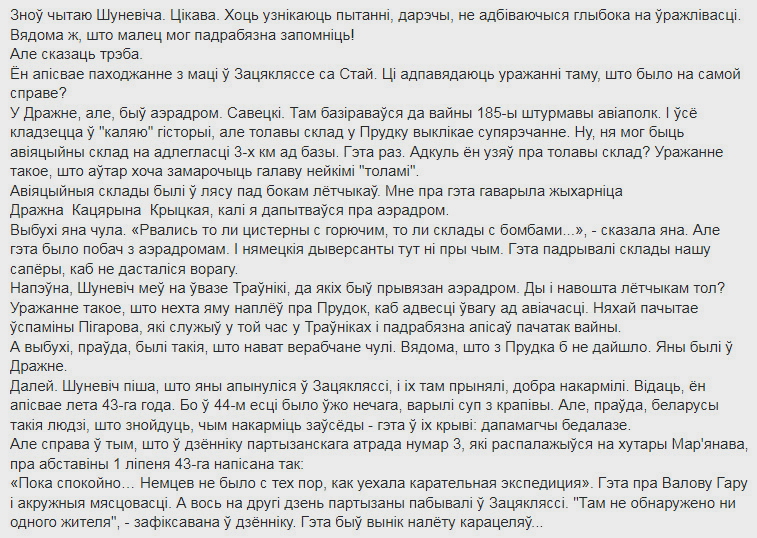 Марцiн , не бачыў такога даследавання. А Шуневіч вядзе паслядоўную храналогію акупацыі. Дойдзе і да 44-га году. Пабачым. Яго мемуары не столькі адлюстоўваюць уласную фенамянальную дзіцячую памяць, колькі паказваюць яго фенамянальную працу па апытанні насельніцтва яго роднага краю. Ён размаўляў практычна з кожным, хто выжыў у той калатнечы і не з´ехаў у далёкія землі. І да гэтага часу аб´язджае жывых сведак, часам мяне прыхоплівае з сабой, водзіць па трагічна-гераічных мясцінах, адкуль і з´яўляюцца здымкі тых куткоў.