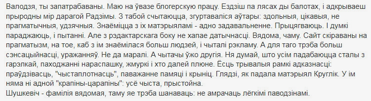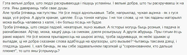 Калі хто нешта надумае пісаць пра мяне, валіце ўсё, што думаеце. Я так і змяшчу ў блог. Вось прыклад.