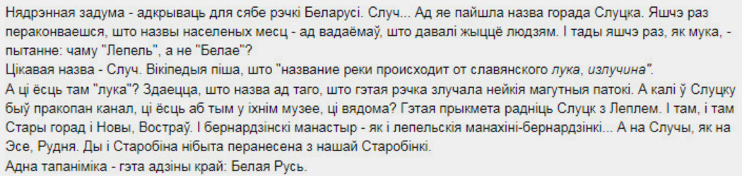 "Случ мяне прывабіла выключна як найбольш важны для майго дурнога розуму аб´ект у Слуцку. Таму і падаўся да таго, што мне больш цікава. У далейшым мяне Случ не зацікавіць - такіх рэчак на Беларусі пад тысячу (на Лепельшчыне лічыцца 20).