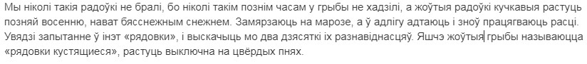 У інэце аб тым сказана папулярна.По поводу спора о "рядовках". Кроме рядовок именно на Лельщине узнал "варушки" (похожи на опята, но не опята и встречаются редко. Их только бабушка собирала и мама распознаёт) и "подольховики" (встречаются часто, но их считают обычно несъедобными). В то же время в Беларуси валуи не брали, а на Урале их местные считают чуть ли не как шампиньоны деликатесом. В общем боровик (белый), подосиновк (красноголовик), подберёзовк, лисичку, опенок, сыроежку... все знают. А вот некоторые разновидности других грибов - кто как. По мне так рядовка - на вид как поганка фиолетовая какая-то.
