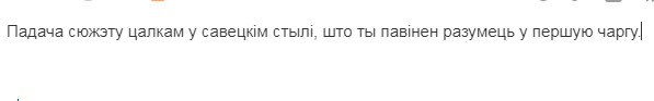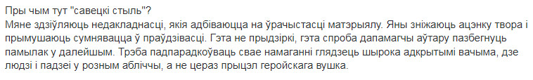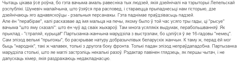 Калі следаваць яе логіцы, то трэба пісьменнікам не прыводзіць да трагічнага канца іх герояў. Я Азаронкаву рэцэнзію ў душы не прымаю, але даў, паколькі той напісаў. Дарэчы, ён па даўняй працы літаратурны крытык, гэта ў яго натуры замацавалася навечна. А прычапіцца можна і да ляжачага камяня. Я гэта таксама ўмею, аднак не прымяняю.Блукач ВАЛАЦУЖНЫ, так я же подчеркнул, что историк, а не писатель. Я в своё время был без ума от Пикуля, но он писатель, а не историк, а как преподносит историю.