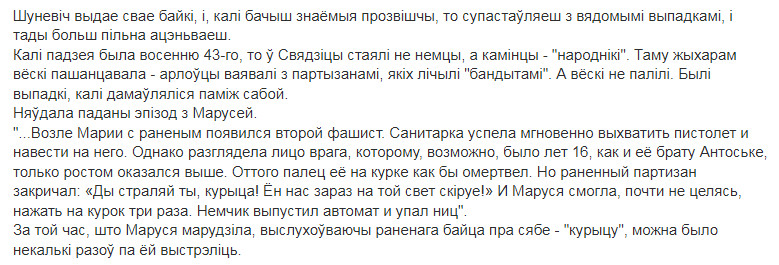 Я побежал на колхозный двор, где оставил Марусю, а тут - выстрелы пистолетные в районе пуни, где должны находиться раненый боец и санитарка наша. Навстречу уже бежал командир взвода разведки. Виновато разведя руки, сказал, что на них выскочил старый немец, так пришил его и побежал осматривать другие строения, а тут – выстрелы. Раненый боец сказал, что этот гад прицелился, но почему-то не выстрелил. Комвзвода поднял автомат и увидел, что в нём закончились патроны. Поменять рожок фриц не успел. Но, когда охранник сразил фрица-старика и побежал осматривать соседние здания фермы, возле Марии с раненым появился второй фашист. Санитарка успела мгновенно выхватить пистолет и навести на него. Однако разглядела лицо врага, которому, возможно, было лет 16, как и её брату Антоське, только ростом оказался выше. Оттого палец её на курке как бы омертвел. Но раненный партизан закричал: «Ды страляй ты, курыца! Ён нас зараз на той свет скіруе!» И Маруся смогла, почти не целясь, нажать на курок три раза. Немчик выпустил автомат и упал ниц. Раненый понял состояние женщины и успокоил, как мог: «Ты не перажывай, так бывае ўпершыню. Мог пацан нарабіць бяды і табе, і мне».