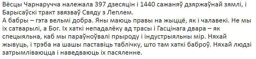 - Вось дык азадачыў ты бабра! Спілаваў ён быццам дрэва, а яго і абсякаць не трэба - гладкае да верху і нават вяршыні не мае. Узяўся за другое - тое ж самае. І трэцяе, і чацвёртае ... такое. Узрадаваны такой халявай, усе твае падпоркі на ўласную будоўлю перанёс.
