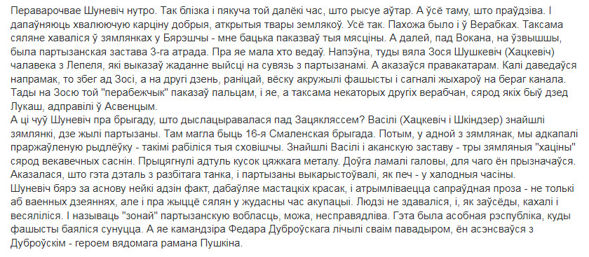 В войну мне приходилось бывать в соседних деревнях Барсуки и Затеклясье, поскольку в Барсуках родилась моя мама и жила бабушка, а в Затеклясье моя тётя Франуся Шуневич вышла замуж за Яську Козловского. Поэтому я в некоторой степени знаю, как там проходила жизнь в оккупации.