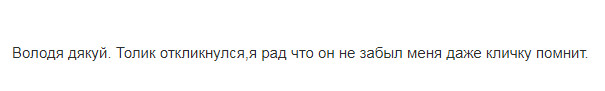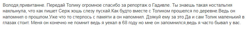 "Валодик, Толянов телефон скинь. Я его заметки прочитываю почти с плачем. Всё давнишнее помню: и про мотоцикл "Яву", и как я был у них в гостях в Питере, и как забыли фотик в телефоне-автомате. Не умею выходить на связь в телефон. Зато часто бываю у моей крошечки Олечки. Мой "фиатик" дорожечку сам знает до хозяйки. Вас вспоминаю хорошими словами, а Витечку - это не то слово! С приветом Черейщина. Бядую без Оли.