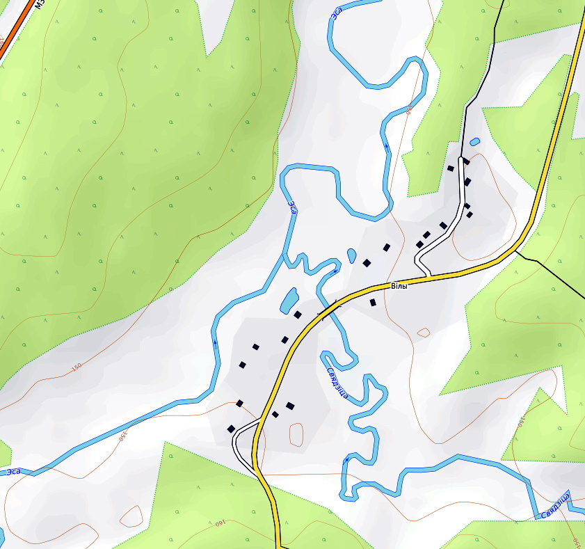 Несцерка, вось мапа сутокаў Свядзіцы і Эсы. Хутчэй за ўсё сінія стужкі нагадваюць двухзубыя вілы для стагавання сена, або кухонныя - для выцягвання катлоў з печы. З вілашнікам.