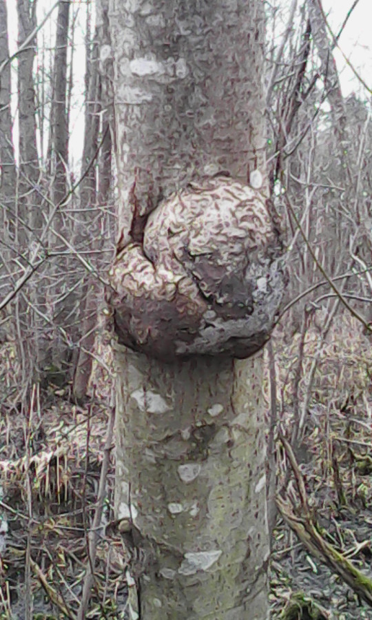 Выбрал направление кювета ближе к Эссе. Без труда перебрался на противоположную сторону заполненного водой придорожья. Сразу ужаснули большие наросты на стволах ольхи.
