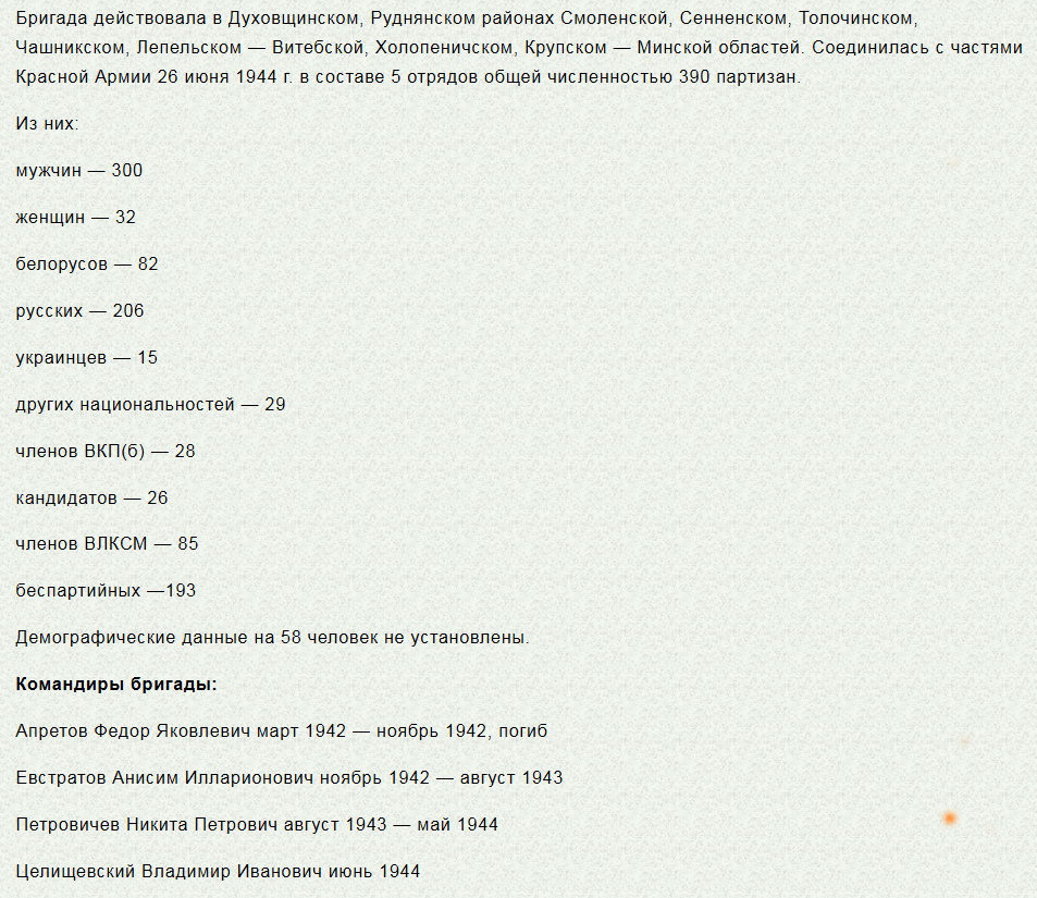 Жилин Семен Дмитриевич август 1943 — июнь 1944".Шлапаков указан в составе этой бригады как командир отряда.Про 1-ю Смоленскую у Лобанка ничего нет, ее как бы не было в его подчинении. Это очень странно. Информация появилась недавно, если верить интернету, то в результате какого-то "