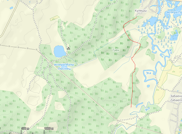 Прыкладна так мы йшлі. Перад Гайком, на ўвесь працяг, галубая нітка - гэта ручай? Дык мы яго перасяклі ў самым пачатку. І адразу ўзышлі на увал. Там высокае месца, нехта трымаў абарону, бо засталіся сляды траншэй, і мы знаходзілі гільзы. Па ўвалу пайшлі ў бок мыса, туды вяла старая дарога, па падножжу, з заходняга боку. Потым дарога ўпёрлася ў густыя кусты, мы думалі - не пройдзем, але Хацкевіч павёў далей, і мы ўзышлі на гаць, яна добра адчувалася пад нагамі. Зрабілі прывал, і пайшлі далей. Хутка ўзышлі на новае ўзвышша. Гэта і быў прыэсенскі мыс. А на Куляшы мы не выйшлі, бо немагчыма было пераадолець глубокае русла.Звярніся да Хацкевіча, ён прачэрціць падрабязны наш маршрут.Мяне больш цікавіць гісторыя гэтага месца, бо яно звязана з жыццём і дзейнасцю манахінь-бернардзінак. На першай землямернай карце 1810-1816 гадоў там наглядна паказан фальварак "Заболінъ". І паказан шлях, што вёў якраз туды - даволі шырокі. І ён перасякаў рэчку, відаць, Гаць, але назвы на той карце няма. Там было бяспечнае месца - з усіх старон вада. Але гэта быў таксама прамежны пункт, бо далей дарога спускалася ў бок Лугоў. Магчыма, на мысе, каля Эсы, путнікі адпачывалі, а можа, фальварак прынімаў галоўную манахіню, якая наведвалася з Вільны...
