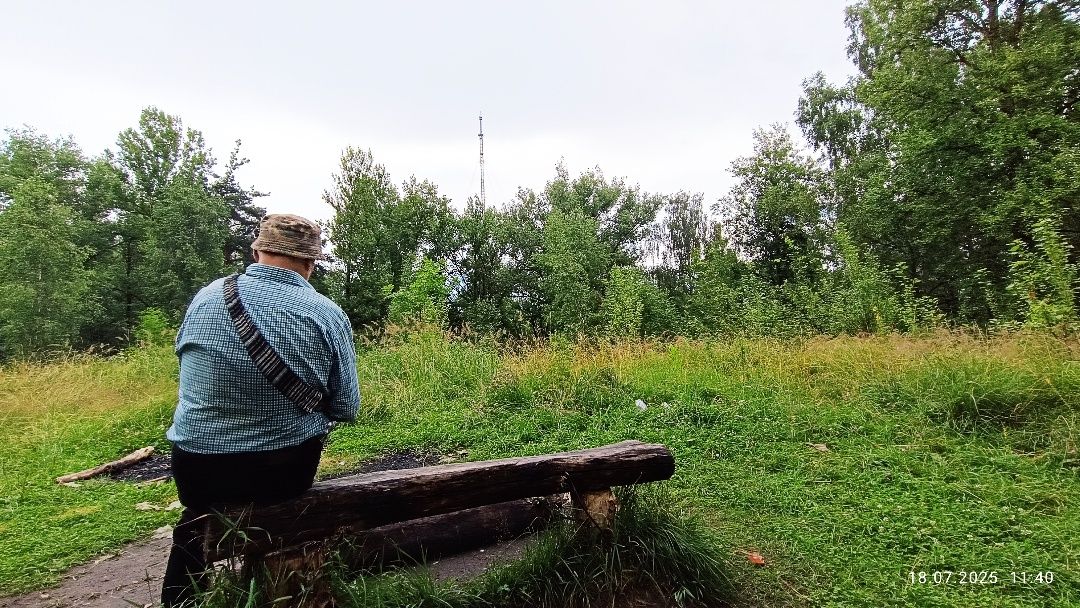 Вышка впереди, на горе. Это деревья мешают ей попасть в кадр. Но прямо на кручу тропка отсутствует, надо обходить слева или справа. Справа на крутом берегу гужуют выпивохи. Ну их к бесу, лучше пойду в противоположную сторону. А Яновский пусть себе бежит возле компании – его ведь она не тронет.