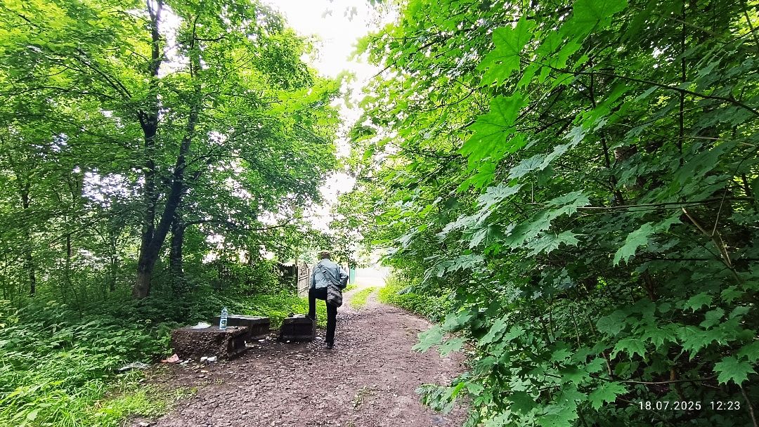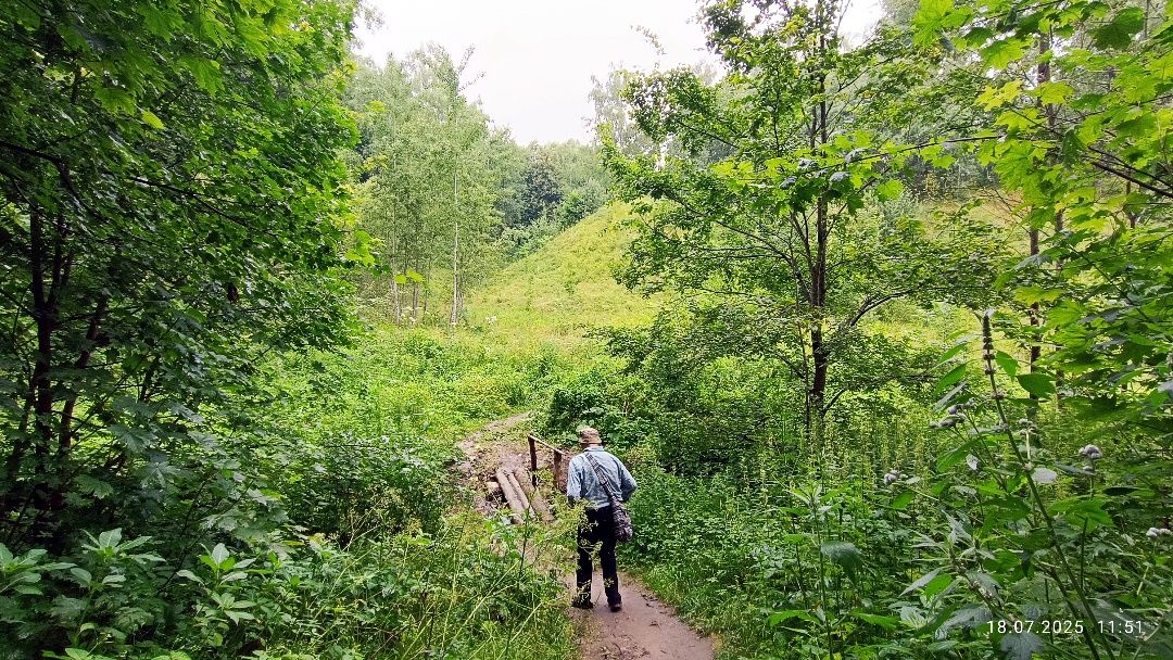 От удовольствия, что оказался прав, аж подскочил на скамейке – кто бы мог подумать, что вокзал в областном центре всего лишь на 147 метров вознёсся над морем! Продолжу дальше пробираться к вышке. Поначалу спущусь во внутреннюю расщелину Юрьевой горы. По тропке внизу только что прошла женщина с большой собакой, однако сфоткать её не успел. Пойду следом, направление соответствует нужному маршруту.