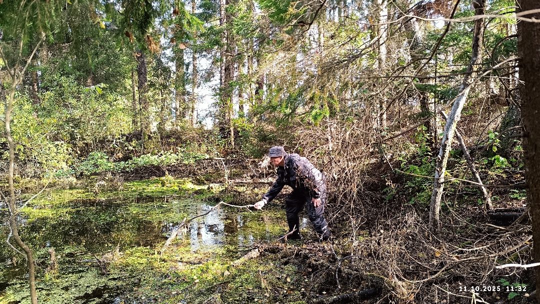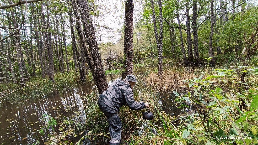 Спустился по склону воронки. Зашёл в воду и постарался зайти поглубже, пока позволят сапоги. Для безопасности подручным дрыном взялся прощупывать дно, чтобы не провалиться в многолетний ил.