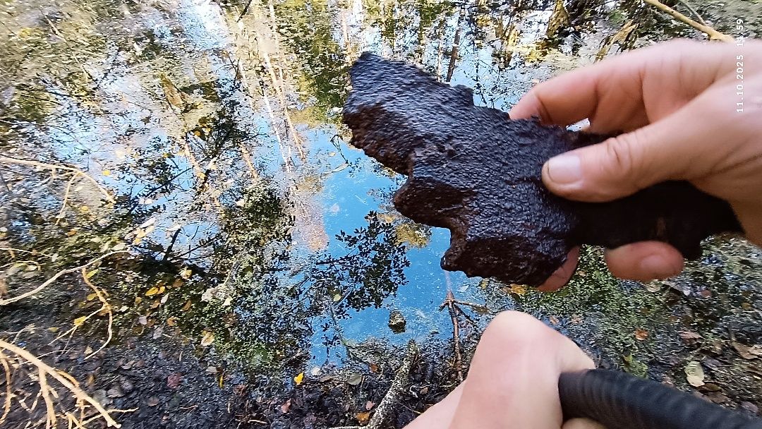 Вдруг щуп упёрся во что-то твёрдое. Камень? Железяка? Неизвестный предмет заинтересовал. Возвратился на берег, отыскал сук потолще и стал подгребать находку к берегу. Не без усилий это удалось. Возле сапог достал тяжёлый грязный ком из воды. Обмыл. И ошарашился. Железякой оказался бесформенный осколок бомбы.