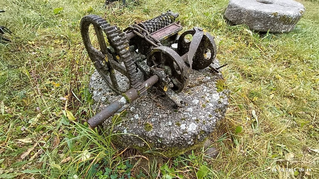 «Произведено в Англии»… Вот так! Каким образом английский шедевр технического прогресса попал в захолустное Реутполье, никто никогда не узнает… В круге, образованном информационной отливкой, находится конская голова. Она же имеется и под редуктором. Возможно означает, что механизм предназначен для измельчения кормов лошадям.