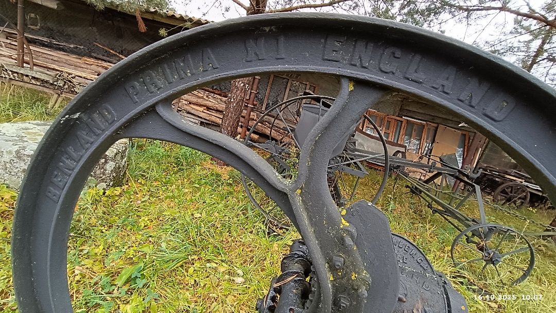 Попробуем читать отлитые тексты с приводного колеса: “BENLAND PRIMA №1 ENGLAND». Сразу же залезем в онлайнпереводчик: «БЕНЛАНД ПРИМА №1 АНГЛИЯ». Не совсем понятно, но достаточно, чтобы знать происхождение машины.