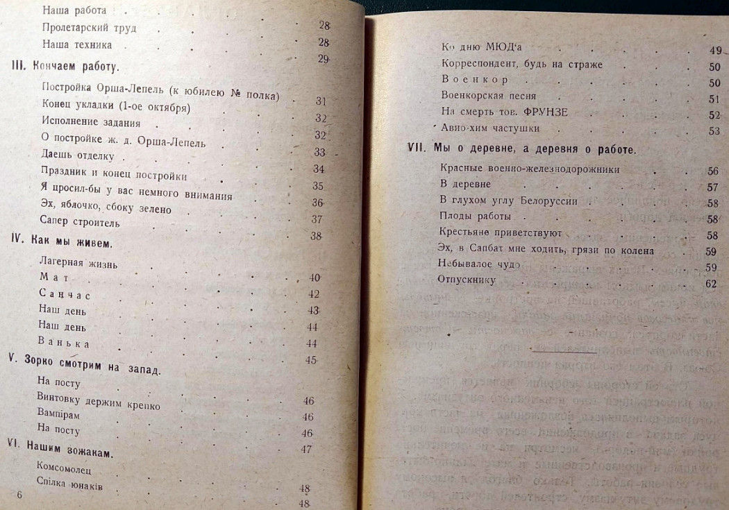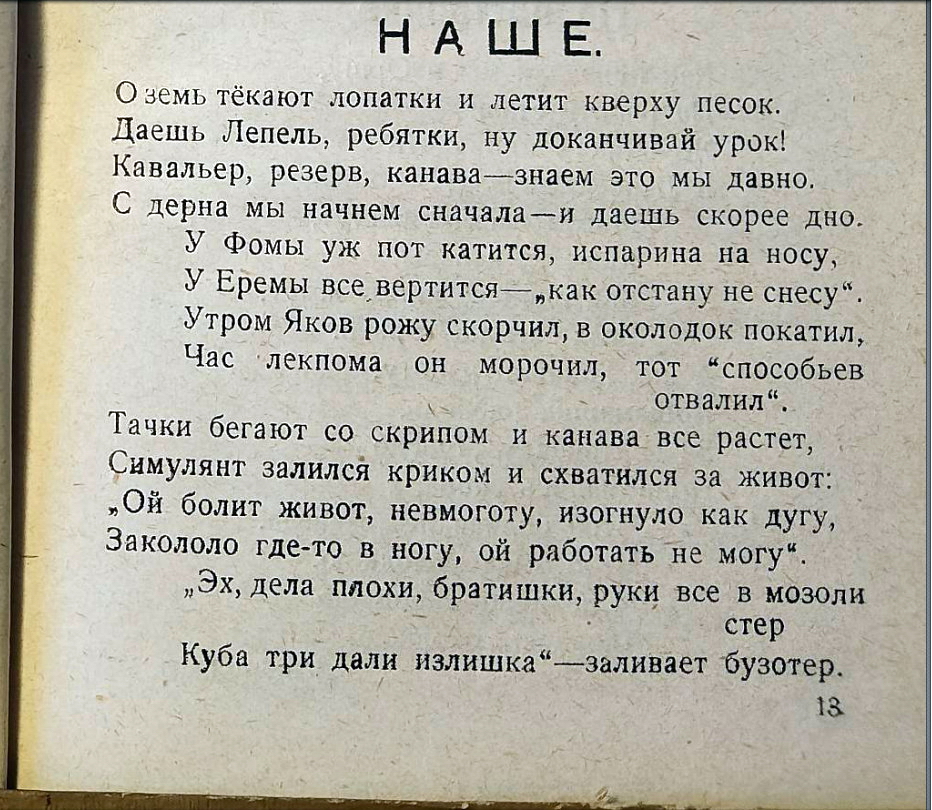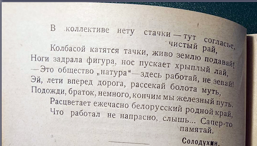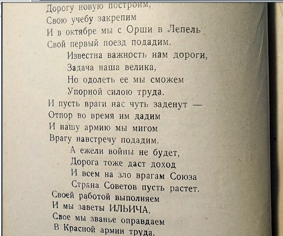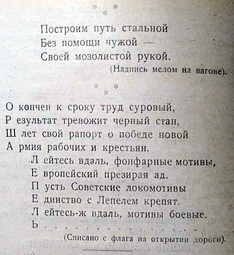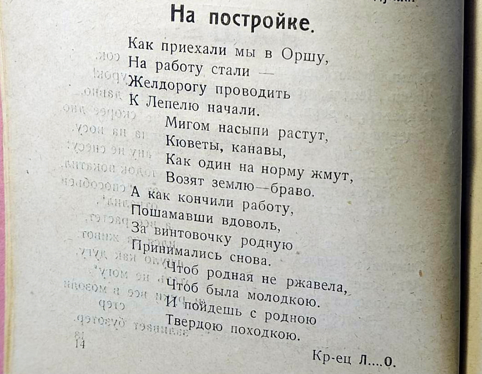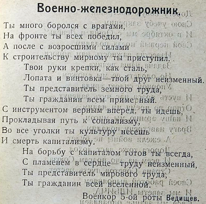 Позже зазвучит поэзия строителей БАМа. А в 1925 году в белорусской глубинке красноармейцы железнодорожных войск вкладывали непомерные силы в «общее строительство страны» под звуки своих неказистых и простодушных стихов и песен.