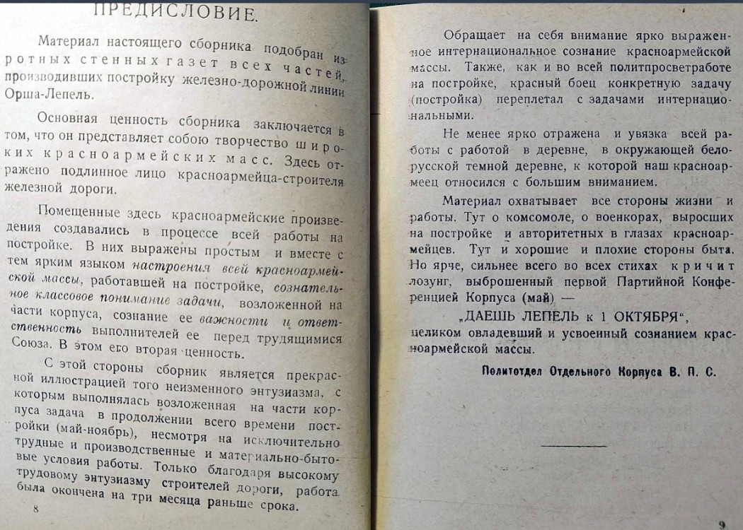 Нет сомнений в том, что такие стихи и песни были подспорьем для строителей-красноармейцев в нелегкой работе. Произведения оптимистического звучания с их верой в счастливое будущее, прославлением ударного труда создавали позитивный настрой и заряжали энергией. Не исключено, что в стремительном создании Оршанско-Лепельской железнодорожной линии есть заслуга и сочинений, вошедших в эту книгу.