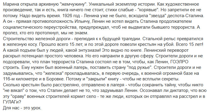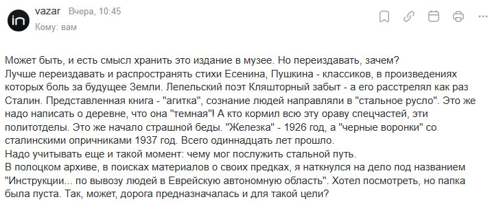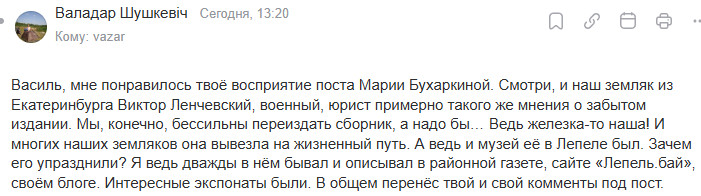 Представленный Марией Бухаркиной сборник по моему мнению представляет историческую ценность, поскольку отражает дух эпохи 20-х годов: революционный подъём, «смычка города с деревней», просвещение крестьян и т.д. применительно к Лепельскому району.