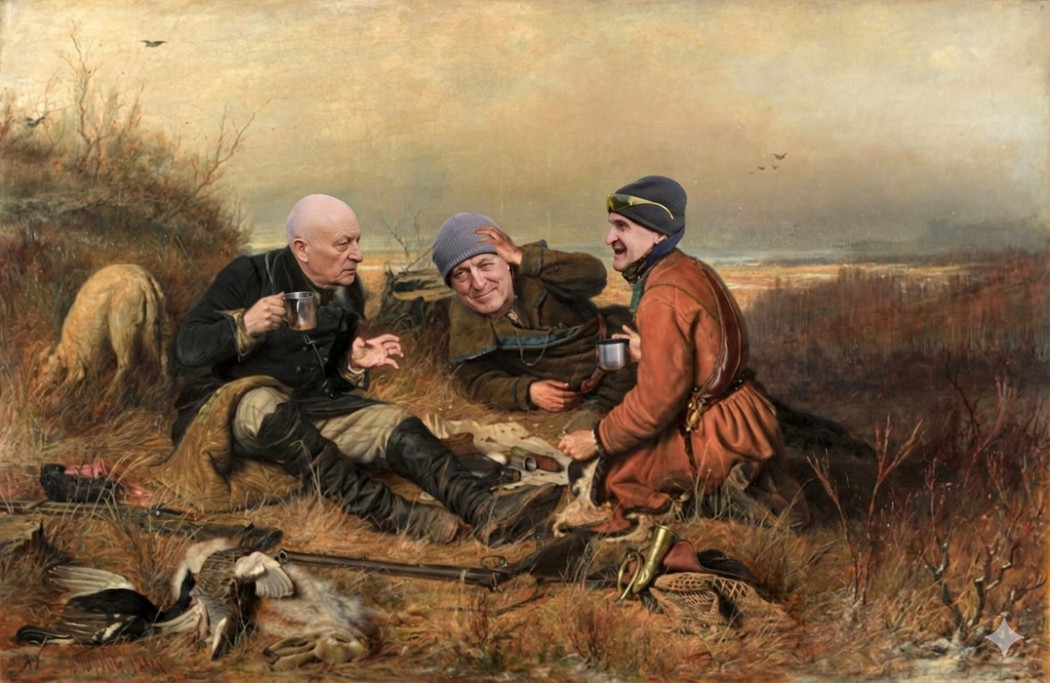 Верхні здымак напамінае карціну В. Перова "Охотники на привале". Толькі не хапае сабакі і трафеяў.